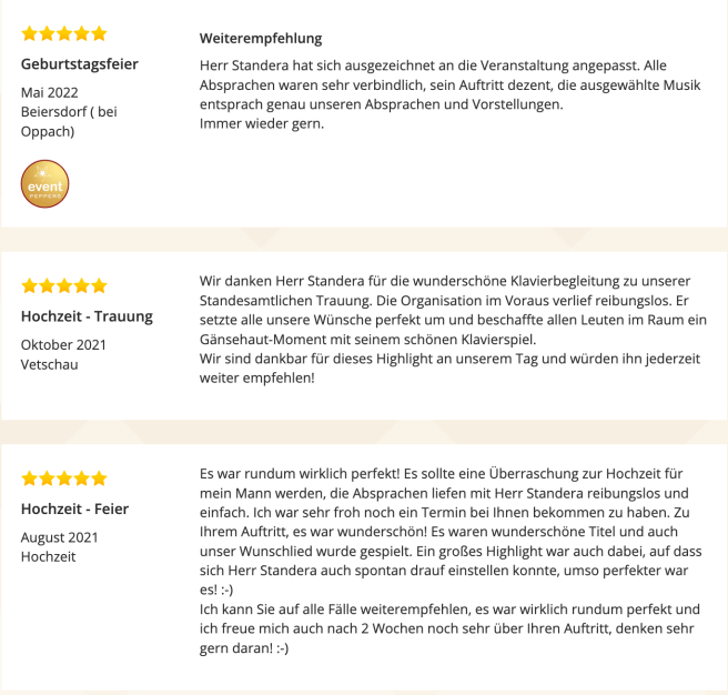 Ob kirchliche, standesamtliche oder freie Trauung – Klaviermusik wird diesen Moment in unvergesslicher Erinnerung lassen. Eine zusätzliche Begleitung durch einen Sänger oder Sängerin ist ebenso möglich.